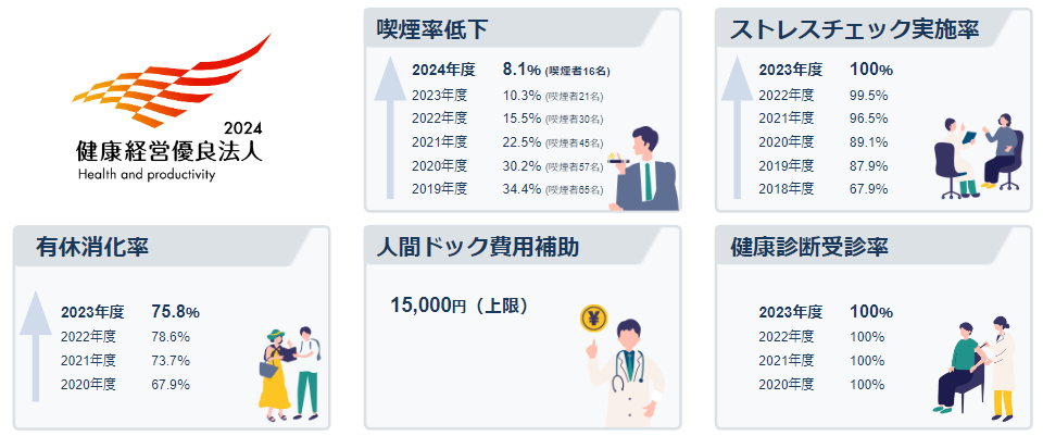 社員と家族の健康の保持・増進を図り、働きやすい職場環境を造ることで、企業の永続的な発展に繋がると考えております。