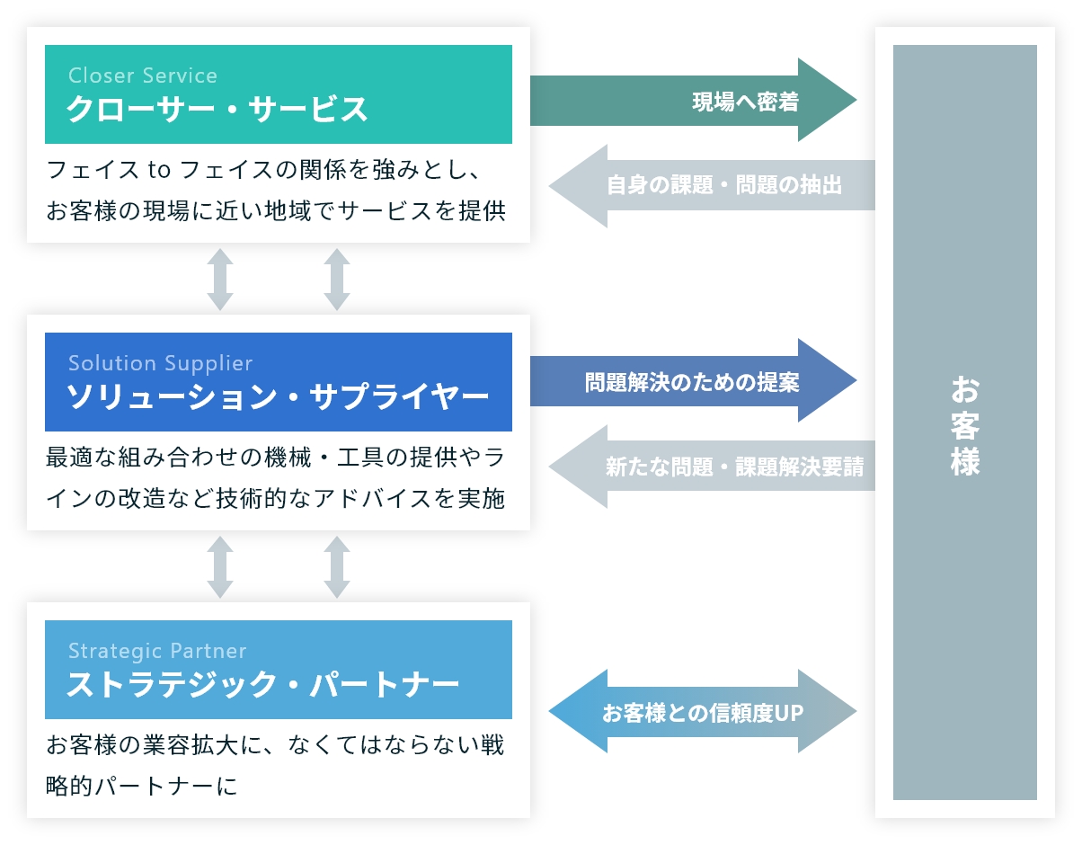 弊社がお客様に提供するものは単に商品だけではございません。機械や工具などは弊社が取り扱う物ですが、弊社ではこれらを使って、お客様に3つの「S」を提供させて頂きます。